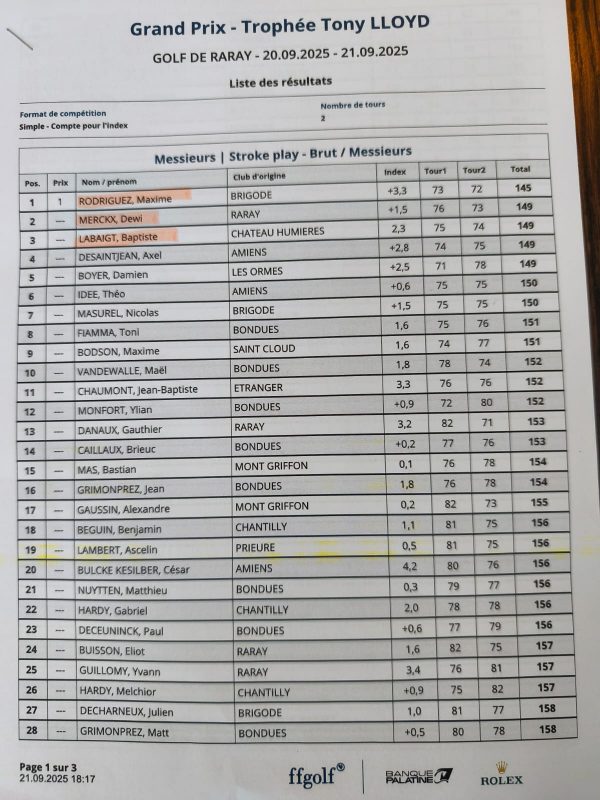 Félicitons Baptiste Labaigt pour son résultat exceptionnel, qui termine ex-aequo à la 2ème place ce Grand Prix particulièrement relevé chez les hommes. Il termine devant nombre de joueurs à l’index négatif. Avec un score de +3 au 1er tour, il sort une magnifique carte de +2 sur le retour.